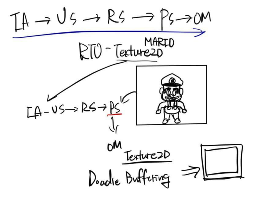 그다음 PS에 어떤 조작을 가지고 OM으로 이때 시스템 texture2D 더블버퍼링 연결되어있는 텍스쳐로 나가는 방법도 가능하다