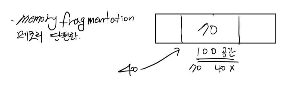 - RAM에서 메모리의 공간이 작은 조각으로 나뉘어져 사용가능한 메모리가 충분히 존재하지만 할당(사용)이 불가능한 상태를 보고 메모리 단편화가 발생했다고 한다.